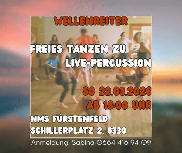 Dein freier Ausdruck im Tanz, Deine Bewegung, inspiriert uns W E L L E N R E I T E R zu unserer Musik. Gemeinsam schwingen TänzerInnen und MusikerInnen miteinander im Rhythmus, im Raum, im Klang, im Tanz – das Spüren der Verbundenheit ist reine FREUDE!